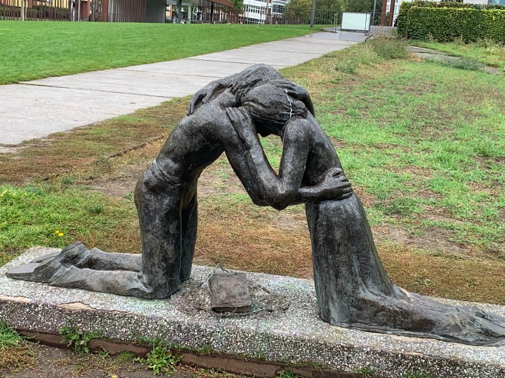In this particular section of the Wall there was a church (ironically called the Church of Reconciliation) that was slap, bang in the middle of the East and West walls that became inaccessible to use once they went up. After much debate, it was decided by the Soviet Union to blow up the church in 1984. Now, adjacent to that site, is a rebuilt church that is a called the Chapel of Reconciliation and there is a sculpture that we immediately identified as the same one as we had seen at Coventry Cathedral. There is only one more of these sculptures, and understandably it is in Hiroshima.